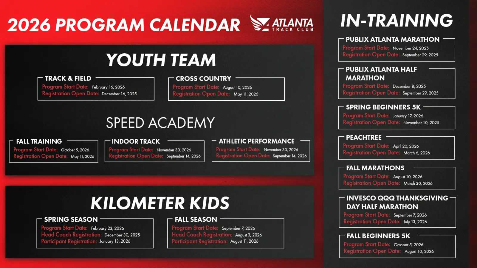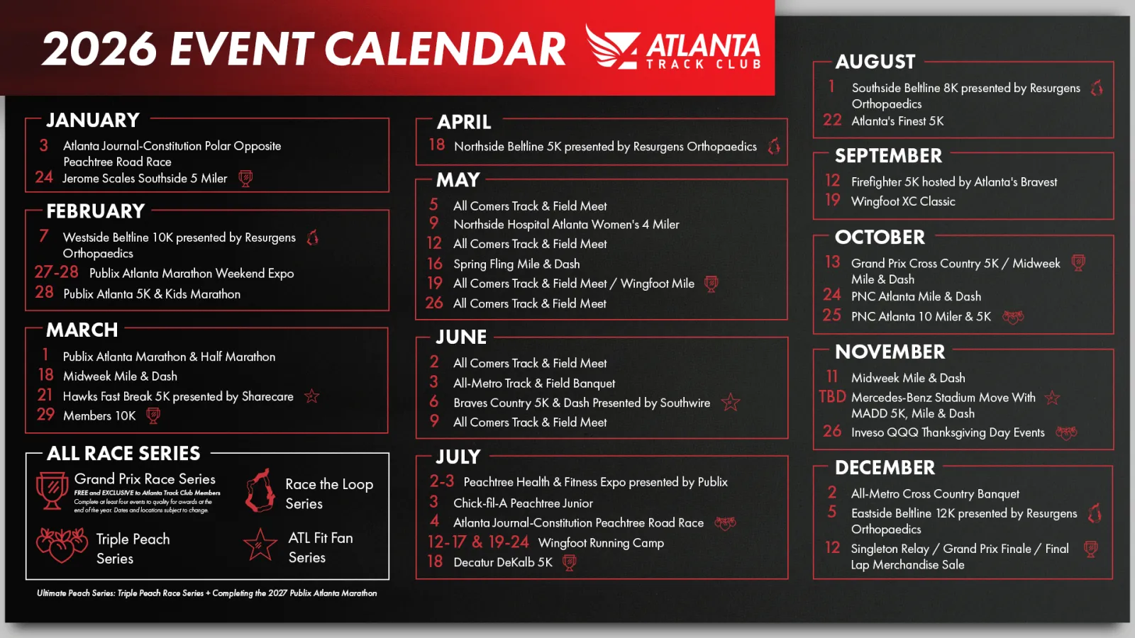 ATLANTA - Oct. 3, 2025 - Atlanta Track Club today released its 2026 calendar, highlighting more than 30 events and a robust slate of youth and training programs aimed at keeping Atlanta moving throughout the year. With a mix of returning favorites, new formats and a full lineup of races, the calendar offers opportunities for every runner and walker in the city.