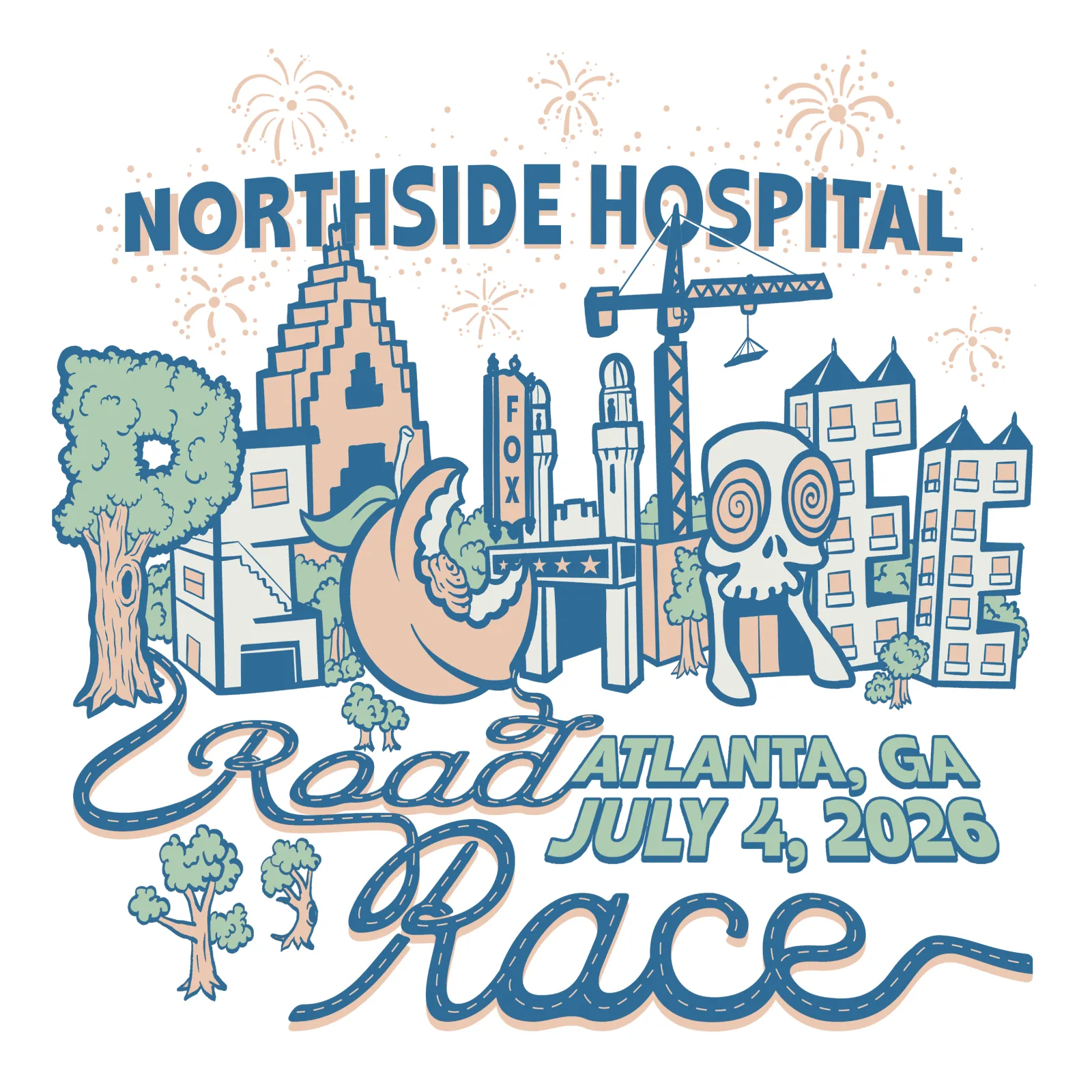 About the Design: The Peachtree has been a Sweeney tradition since the early 80s. As both a runner and a spectator, I am always inspired by the joy and community the race brings. I commute into ATL sometimes and illustrated the moment I see the city skyline, still surrounded by trees. There's a lot of positive energy on race day (even on the 6 a.m. MARTA) which influenced the colors, movement and texture in my design.